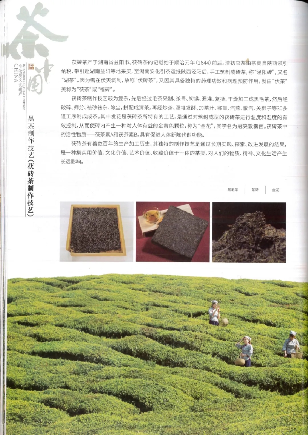 茯磚茶產于湖南省益陽市,是后發酵茶,又屬于全發酵茶。其所含的益生菌-冠突散蘘菌是茯茶必備的獨有品質特征。茯磚茶是邊銷茶的主要品種之一,是西北各名族人民的生活必需品。茯磚茶,唐代以后被官府所控用來茶馬交易,亦稱府茶、官茶。因茯茶對西北各族人民的重要性又被稱之“福茶”。存放完好的茯茶歷久彌香,存放時間越長,茶湯越趨橙紅明亮,也越耐沖泡。茯磚茶中俗稱的“金花”(冠突散蘘菌)能有效調節人體新陳代謝,調理腸胃,并有降脂、降壓、調節糖類代謝的功效。