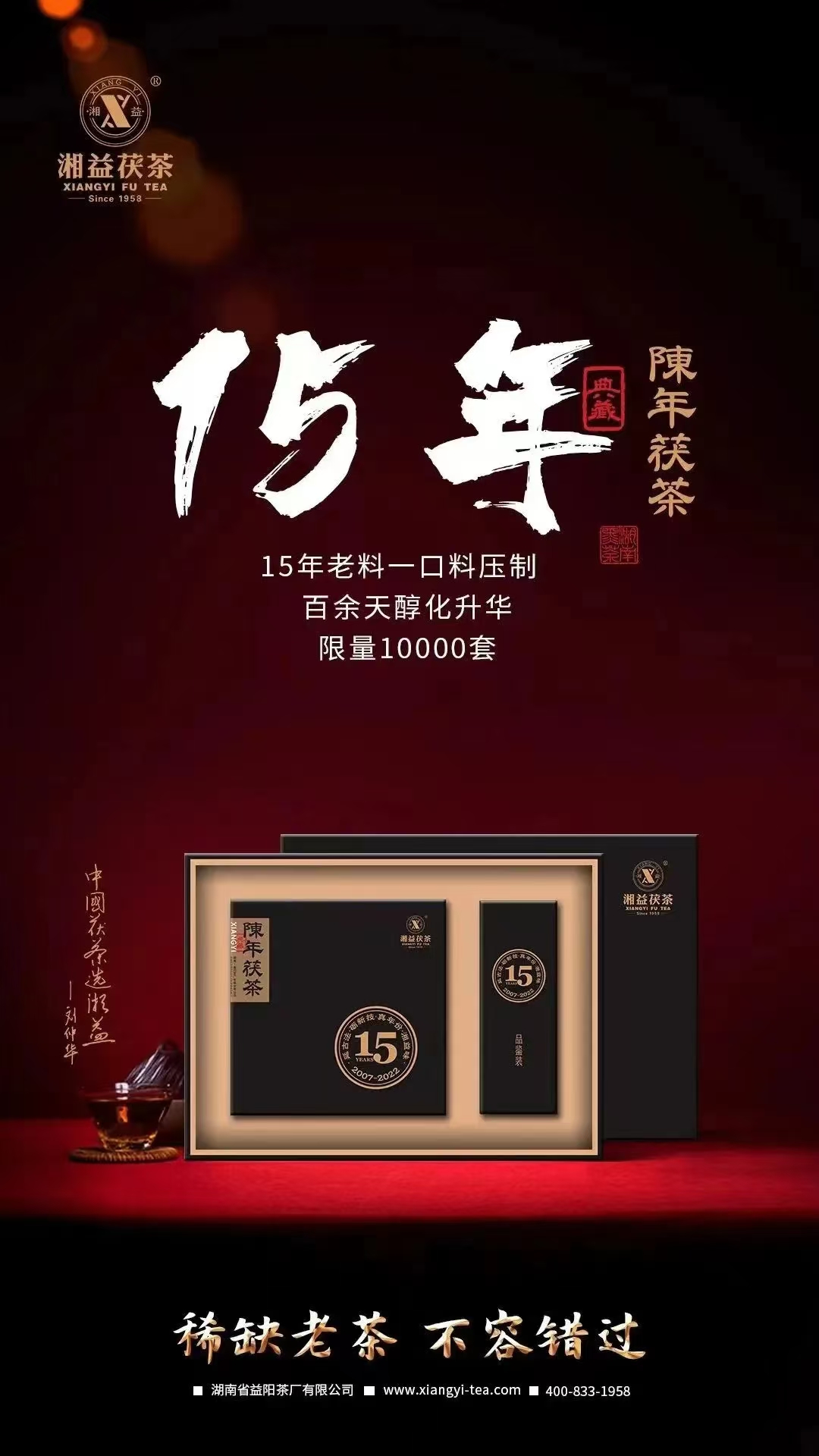 因其原料的稀缺,加之采用一口料制作,?陳年茯茶?限量發售10000套。每套均有獨立編號和典藏證書,并有劉杏益大師的親筆簽名。當下品飲,即可享受15年時光釀就的陳醇好味;投資收藏,保值升值空間十分巨大,未來可期。