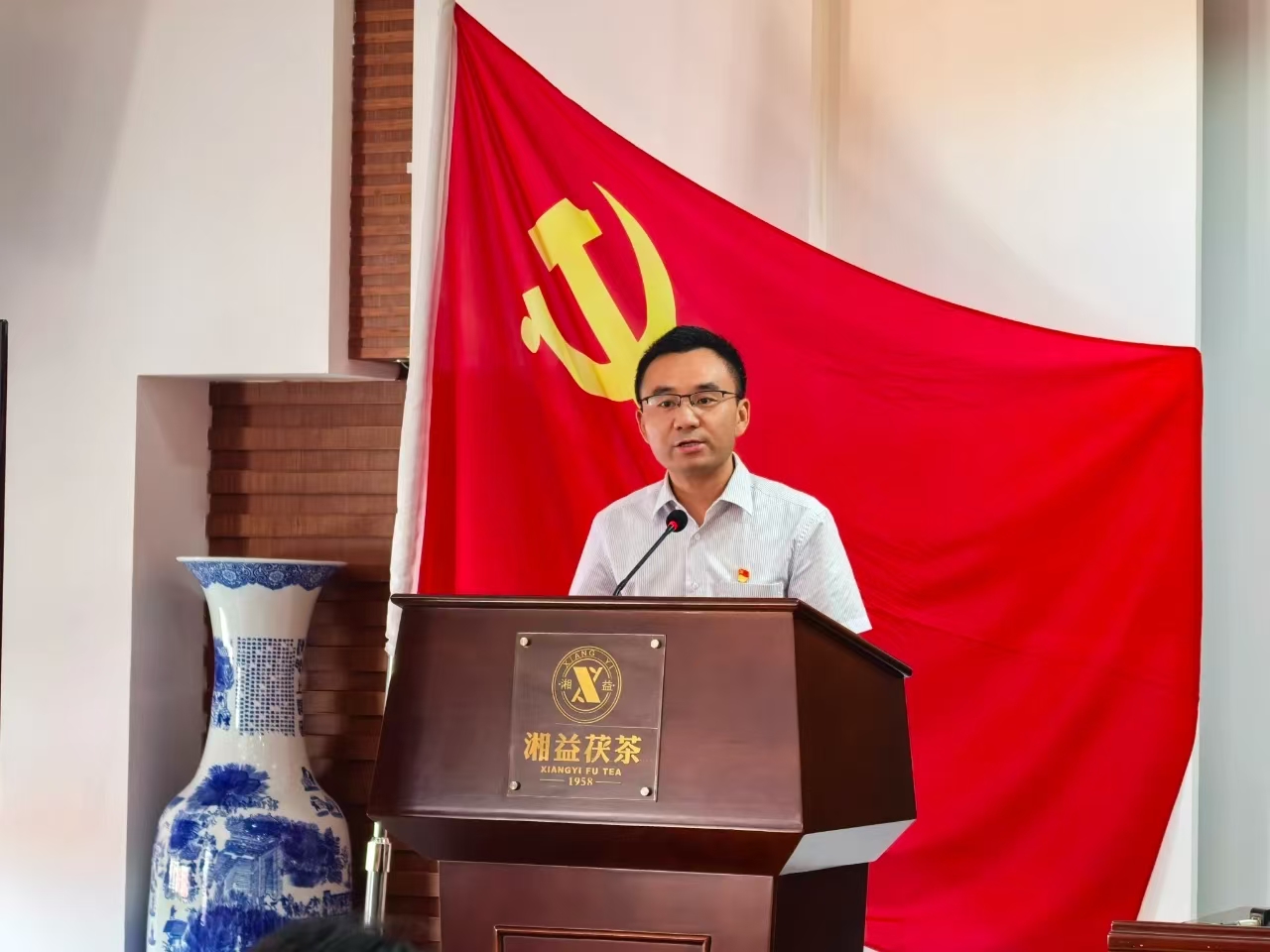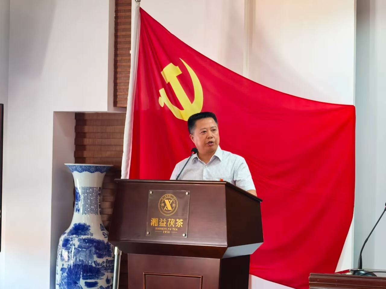 7月1日,在黨的104周年華誕這個特殊的日子里,湘益茯茶全體黨員精神抖擻地齊聚公司6樓會議室。在生產支部書記安茂強的帶領下,全體黨員高舉右拳,面向鮮紅的黨旗莊嚴宣誓。鏗鏘有力的誓言在會場回蕩,仿佛穿越時空,喚醒了每位黨員入黨時的赤誠初心。這一刻,信仰的力量在胸中激蕩,奮斗的熱情在心中燃燒。