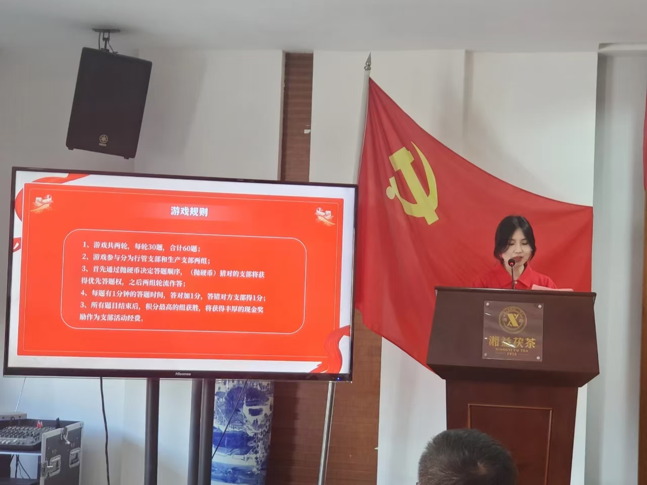 紅色知識與廠史知識問答環節開始,大屏幕上題目涵蓋黨的歷史、重要會議、革命英雄事跡及廠史知識。行政支部與生產支部黨員全神貫注答題,答對題目現場掌聲熱烈。黨員們鞏固黨性知識,加深對黨史廠史理解,認識到紅色政權、新中國、中國特色社會主義及單位發展成果來之不易。